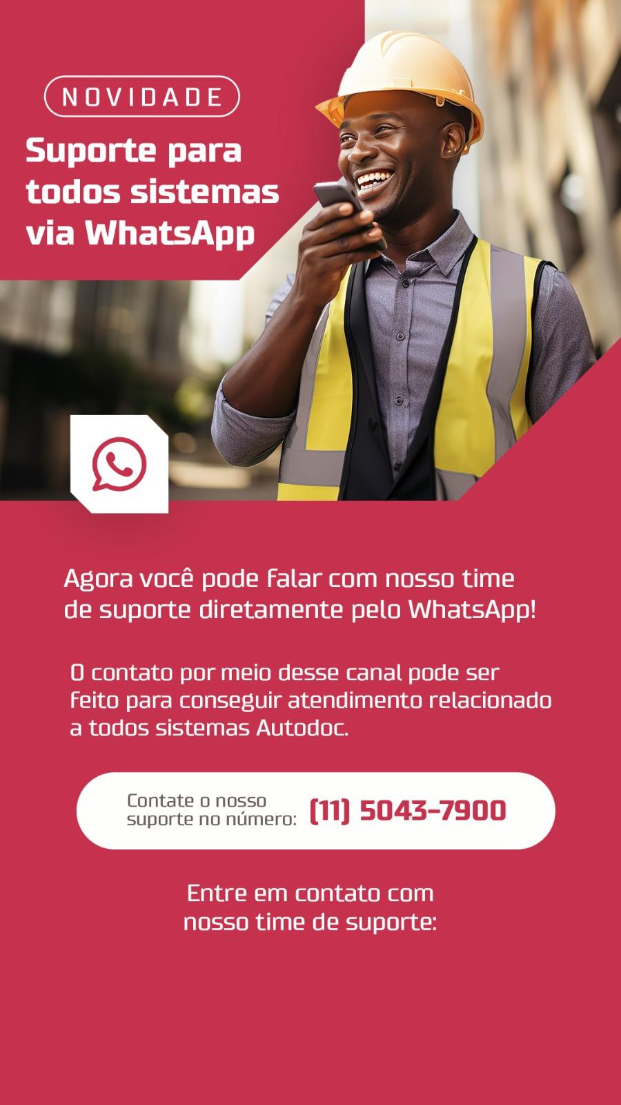 Whatsapp do Suporte! Support 3 de janeiro de 2025 15:28 Atualizado Encontrou o que procurava?Compartilhe sua opinião nos comentários abaixo e nos ajude a aprimorar ainda mais nossos artigos! 👍Sua opinião é muito importante! MicrosoftTeams-image (100).png 100 kB Baixar Artigos relacionados Acesse o Chat Online com a Assistente Virtual Aurora na Plataforma Autodoc Projetos Esqueci a senha do Projetos Web: como redefinir ou fazer o primeiro acesso Whatsapp do Suporte! Whatsapp do Suporte! Visualizar listagem dos usuários Comentários 0 comentário Por favor, entre para comentar.